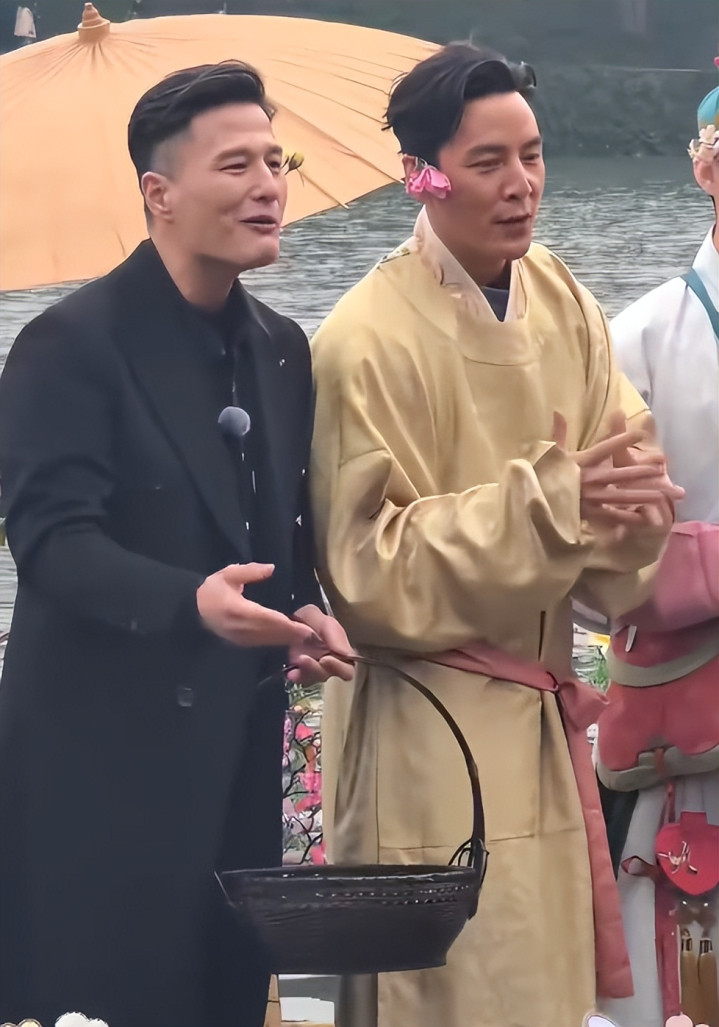 吴彦祖穿了一身黄色汉服,头戴簪花,腰间佩玉,身姿依旧挺拔,妥妥的古典公子模样。
