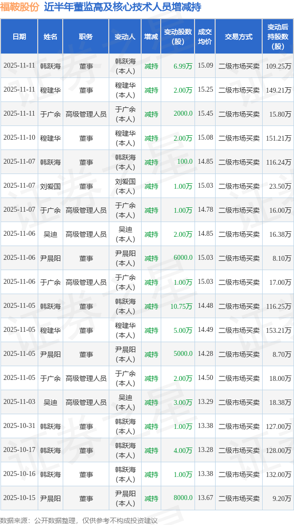 证券之星消息,根据11月11日市场公开信息、上市公司公告及交易所披露数据整理,福鞍股份(603315)最新董监高及相关人员股份变动情况:2025年11月11日公司董事穆建华、高级管理人员于广余、董事韩跃海共减持公司股份9.19万股,占公司总股本为0.0286%。变动期间公司股价上涨2.03%,11月11日当日收盘报15.1元。