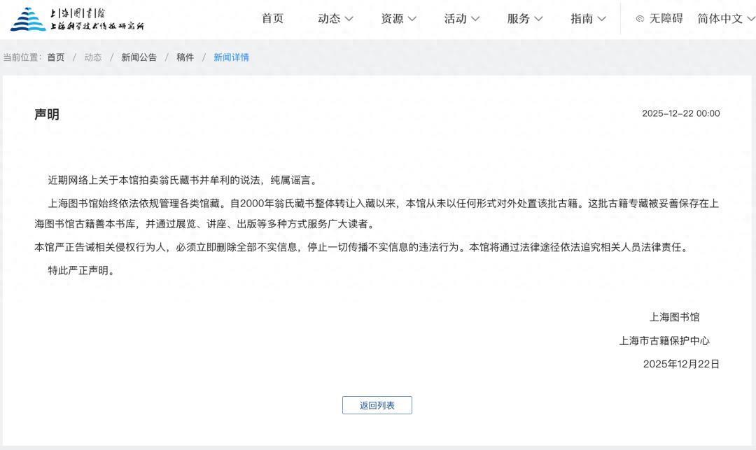 近期网络上关于本馆拍卖翁氏藏书并牟利的说法,纯属谣言。